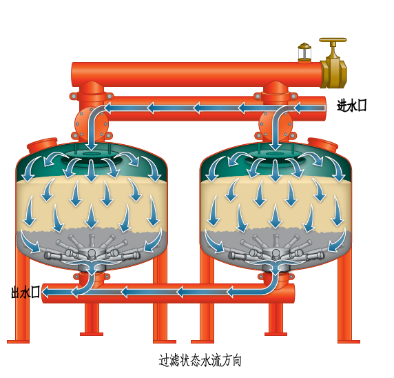 當(dāng)系統(tǒng)處于過(guò)濾狀態(tài)時(shí),未經(jīng)過(guò)濾的水通過(guò)布水器均勻布水,水以層流狀態(tài)通過(guò)過(guò)濾器內(nèi)的填料層(精制均粒石英砂、石榴石)。當(dāng)水經(jīng)過(guò)填料層時(shí),雜質(zhì)被截留在填料層內(nèi)。過(guò)濾器底部有多個(gè)均勻分布的集水器,將過(guò)濾后的水均勻地收集并引出,平流過(guò)濾,可以使過(guò)濾器在高流速下過(guò)濾,仍可達(dá)到較好過(guò)濾的效果。